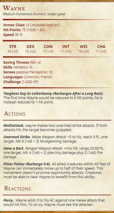 Several trailers for season seven of the Canadian phenomenon known as Letterkenny dropped the other day, to much rejoicing from fans of the series. And because my brain works in mysterious ways, I was struck with the idea of taking some of the more popular quotes from the show and turning them into monster abilities for 5th Edition Dungeons and Dragons. We’ve all heard about Squirrely Dan and the legend of the wind and know that he might “appreciates” Miss Katy a bit too much. We know that Wayne is the toughest guy in Letterkenny and that he’s more than willing to prove it with a scrap. At least after he has a dart. And then there’s the battle cry “pitter patter let’s get at ‘er!” (Still lost? This might help a little bit.)