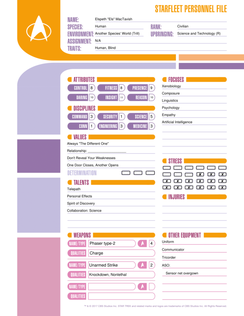 Design & Play Notes: I greatly enjoyed “Is There In Truth No Beauty?” an episode of Star Trek TOS, and Elspeth is based on the guest character. She is statted as a full PC, but is also suitable for either a Notable or Major NPC. (Appropriate numbers of Traits, Focuses, Talents, and Values for these types of NPCs can be found in Chapter 11 of the core book.) Note that as a PC, GM permission is needed for the Telepath talent, and, in most eras, to be non-Starfleet. Academy and Career Lifepath steps are the civilian equivalents of Starfleet Academy and Experienced Officer. I have left the relationship Value, Career Events, and Backstory partly or totally open so players can customise.