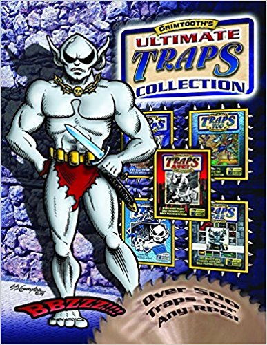 This is one heavy duty (460 pages!) softcover gaming supplement, available for about US$36 on Amazon (hardcover $50). The collection includes all of the standalone sourcebooks published plus a lot of extra content–interviews with those involved in creating them, cover art from various editions, and new material. Traps Too has a detailed section on using the traps for the Fudge RPG, which was the basis for the Fate system. The traps have been redrawn by the original artist. One big caveat: Grimtooth comes from the era of RPGs when scenarios were tough, and well, grim. “GM as Deadly Opponent” was a very common style of running a game in the ’70s and ’80s–if not the only GMing style. These books are a product of that mindset, in my opinion, and take it to the extreme. These trap creators clearly believe that E. Gary Gygax coddled his “Tomb of Horrors” players and didn’t put enough effort into making it a TPK scenario. I estimate 99% of these traps will leave PCs dead, dead, beyond-Reincarnation/Resurrection-spell-DEAD, regardless of how few skulls they have! (Traps are given a rating of 1 to 5 skulls or similar symbols.)
