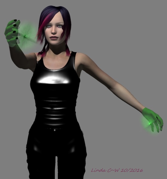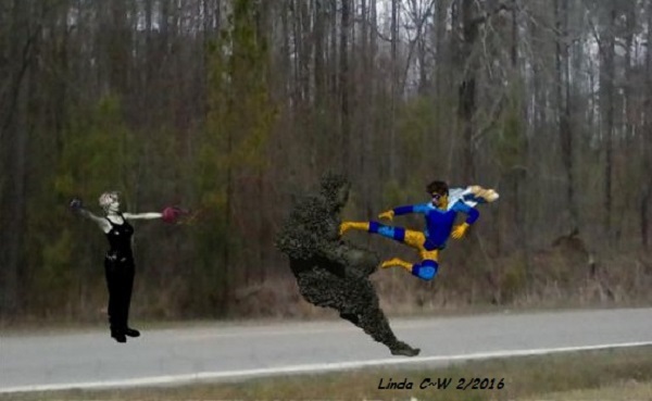 One fine day–I got bored, so I opened up Carrara, the 3D art software I use, and started playing. I took a photo of the street outside our house as a backdrop (less work and less RAM) and created a couple supers and a “monster” for a fight scene. And this quickie art project inspired some Mutants & Masterminds characters.