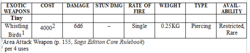 I grouped Whistling birds in Exotic Weapons, since most Exotic Weapons are limited to a particular culture (e. g., bowcaster, cesta, amphistaff). They are Restricted to the Mandalorian culture, although, as the core book mentions, anyone, with “sufficient patience and cash” can obtain Restricted gear. If, in this case, they want to risk offending every Mando they meet. Mando’ade, after all, aren’t cool with outsiders appropriating their cultural weaponry and armor. (Nope, not even for a Good Cause. See Season 2, Episode 1.) So there’s a lot of risk to both seller and buyer.
