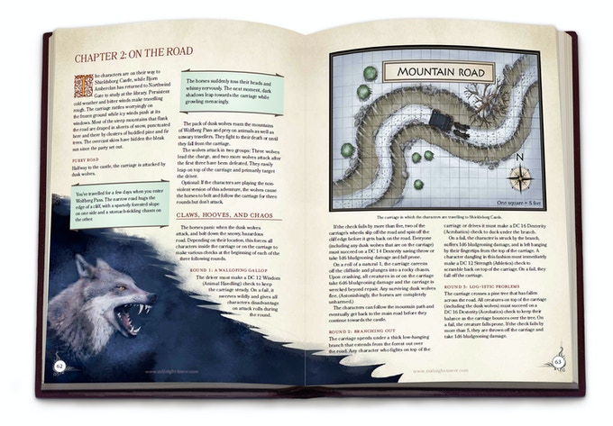 ERIK: The adventure Before the Stroke of Midnight will feature the backstory, maps of the castle and its grounds, nine detailed NPCs, the Dusk Wolf (a new monster), Ring of the Serpent’s Tongue (a new magic item), and legend and lore about Shieldsborg Castle. There’ll also be a section on how to scale encounters so that the adventure can be played by characters of all levels, and we’ll create digital VTT files to make the adventure easy to play online.