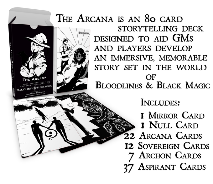 JS: The Arcana is an 80-card storytelling deck inspired by the Tarot. Every player at the table is assigned multiple cards they can use in play to modify, adjust, or otherwise influence the encounter in which the card appears.