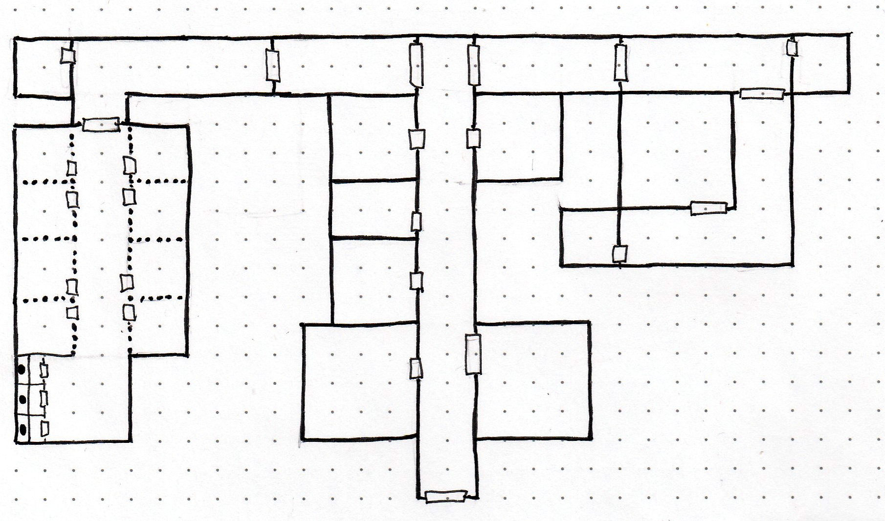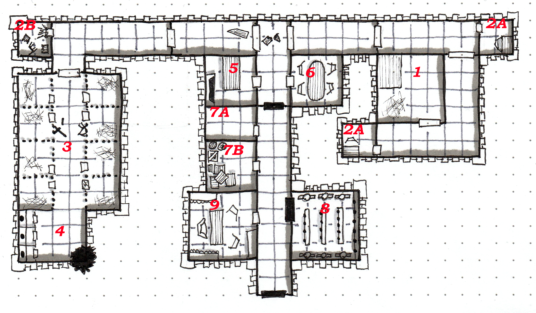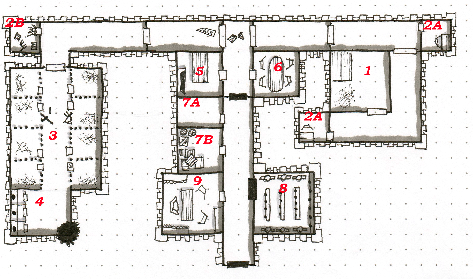 Room 1: Main Cell A large fortified door separates this cell from the rest of the compound. In one corner lies the horned skeleton of the cell’s final occupant. The walls here are covered in lichen and moisture, and the despair that the prisoner must have felt is almost palpable.