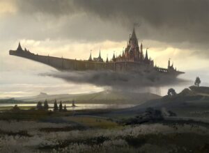 The castle is a floating island, topped with a gigantic castle of indeterminate construction. It is centuries old, potentially far older than the 500 years that people know of, but the methods of construction used are far beyond what anyone can make in this day and age.