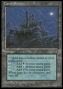 Castle Sengir sits on a lone mountain, in a desolate area. Nothing lives for miles around, not even mice or grass. Eternal night blankets the land, with the sun having been blocked out by the thick clouds that occasionally spew forth from the highest towers of Castle Sengir. From within its darkened walls, a curse emerges as Vampires roam the land under the control of the Blood King.