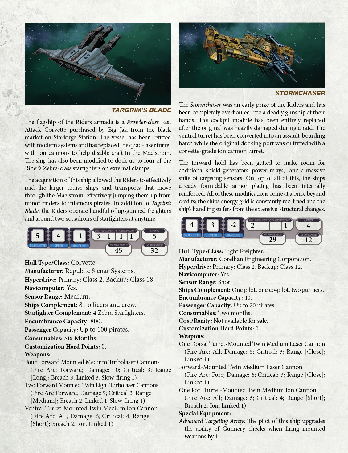Over the years, the Riders have mapped extensive routes through the Maelstrom Nebula and use this knowledge to raid shipping and passenger transports along the Relgim Run. The pirate gang rarely commits the full fleet to a given raid unless it is a particularly big score (for example, a passenger liner or container ship). Splitting up the fleet also helps the attacks seem like isolated crews rather than an entire pirate fleet – which would draw unwanted Imperial attention.