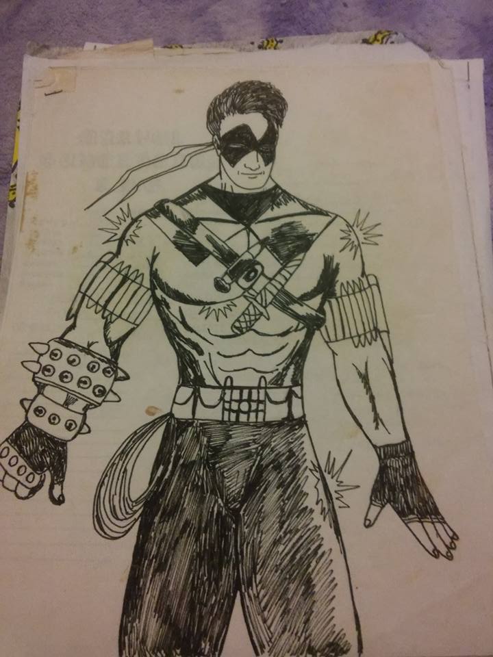 A character by my old neighbor pal, Josh. Definitely reflects the Iron Age of Comics. Art and character by Josh Pollock.