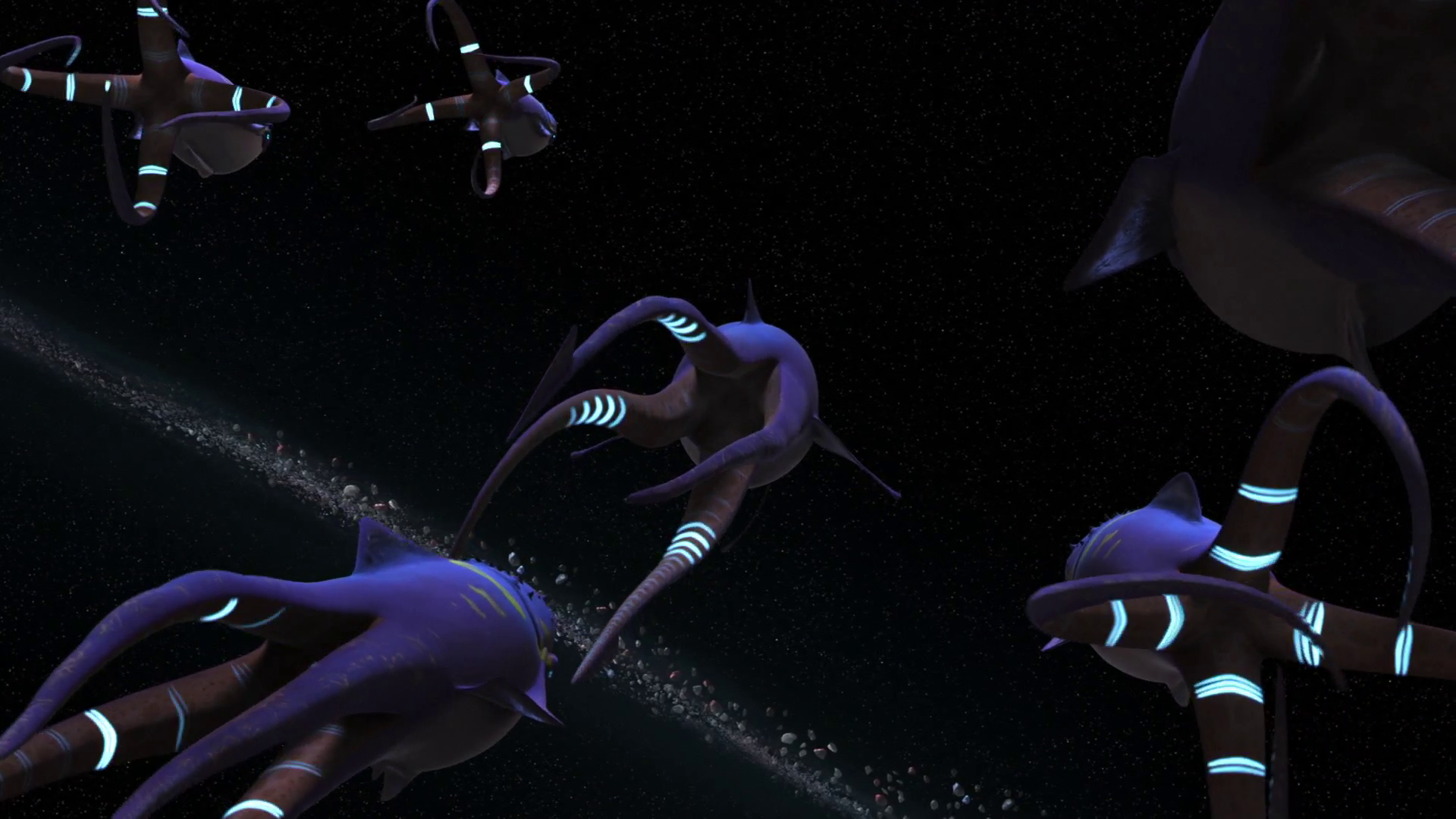 Purgills are a rare form of space fauna. Giant, whale-like creatures, the purgill move through space using specialized organs found in their tentacles and fins. Capable of surviving in both the vacuum of realspace and making the jump between systems via hyperspace, the purgills depend on Clouzon-36 gas to power their unique biology. The purgill are gentle by nature, moving through the galaxy in multi-generational packs. Despite this nature, these creatures are considered a danger by spacers for their tendency to crowd hyperspace lanes.