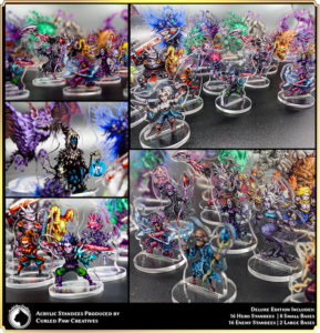 For the price of $55 you get the full base version of the game. This includes the game board, all the necessary cards, tokens and colorful cardboard figures and stands for all enemy and friendly characters. The Deluxe edition gives you a nice storage box, upgrades all of the character standees to colorful acrylic versions, gives you a neoprene mat instead of a board and some fancier cards and dice. This is a $70 increase in cost but is still not a ridiculous price. I’ve seen many Kickstarters where deluxe editions run into the hundreds of dollars and the base game is well over a hundred. The character being standing templates instead of full miniatures is a mixed option. On the one hand, the artwork for the characters is very nice and in full color, so no painting necessary. I expect the deluxe acrylic version will hold up quite nicely, but the base game cardboard is well, cardboard.