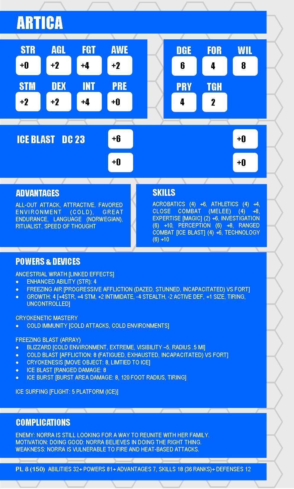 • Known Abilities: Norra is capable of generating and controlling ice and cold. She can alter her local environment, making it colder and attacking enemies with a blast of a ice and cold. She sometimes assumes her ancestral form; giving her enhanced strength and durability but is so far incapable of controlling this transformation.