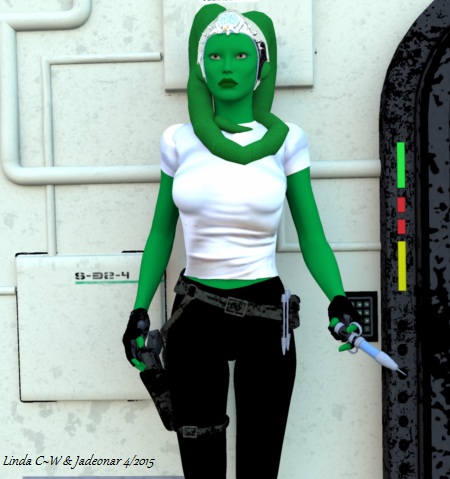 Description & Personality: A’lura is a green-skinned Twi’lek with lekku a bit longer than usual and eyes of a copper-gold shade. She dresses in coveralls typical of spacers–but keeps them much cleaner and neater than the spacer-stereotype, since she was used to being in a lab or operating room. For the same reason, she doesn’t like disorder in the galley, engine room, etc. She has adjusted pretty well to her new working conditions, though, and won’t hesitate to use that galley table for surgery–and to draft the ship’s Captain as her scrub nurse. Although not likely to be as skilled as her partners in other areas, A’lura will try to pull her weight, usually by acting as a lookout, prepping the ship for a quick takeoff, or in social encounters, for example, charming an employer or seller.