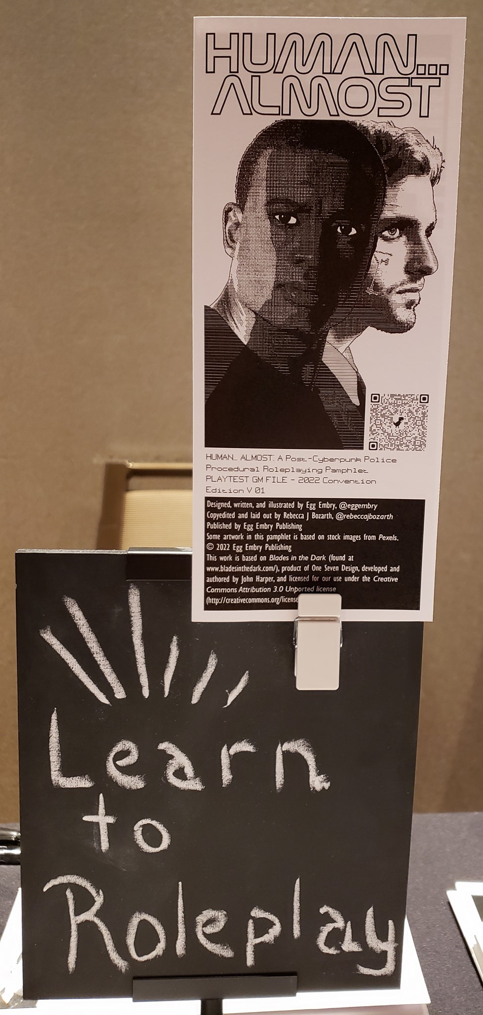 Despite bringing RPGs to sell, my goal for the convention wasn’t monetary, it was connecting with fans. Specifically, I wanted to get more copies of my newest and free (and well reviewed) playtest, HUMAN… ALMOST, into the hands of potential gamers. My measure of success would be expanding the number of gamers that indulge in tabletop roleplaying games. Demos and free games can help to make that happen.