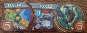 Throughout the game you’ll control several races. Each one will have a certain number of tiles representing their population. The Flying Trolls in the example above had 10, five from the Troll banner and 5 from the Flying power. To conquer a territory you need a minimum of two Trolls. If the tile is defended or has other special features like mountains or fortresses (like the Trolls give) you’ll need even more population to conquer it. Once you control a territory, you must leave one of your population tiles there to hold it. So a 10 strength Flying Trolls will never hold more than ten tiles on the map.