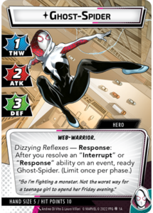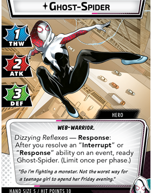 - Dizzying Reflexes – Response: After you resolve an “Interrupt” or “Response” ability on an event, ready Ghost-Spider. (Limit once per phase.)