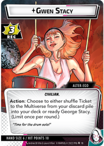 - Action: Choose to either shuffle Ticket to the Multiverse from your discard pile into your deck or ready George Stacy. (Limit once per round.)