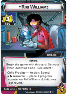 • Child ProdigyAction: Spend a Mental resource → place 1 progress counter on Riri Williams. (Limit once per round.)