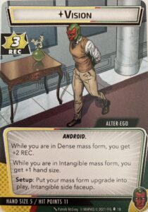 Greetings! Today we’re going to continue our journey reviewing the different heroes you can play in Marvel Champions. We did Valkyrie last month so today we’re moving on to the next most recent (or most recent depending on your store), Vision.