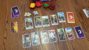 The trick of the game is deciding when and how aggressively you want to go for the victory point cards. You start off with a hand of only two cards. Converting resources to get what you need will be tough with just those cards. Early on you want to acquire as many market cards as you can, giving you greater options and more cards that you can play before you have to spend a turn picking resting. Some cards just straight give you resources, some upgrade resources (resources are upgraded on a track of  Yell0w to Red to Green to Brown), and some trade a certain set of colors for another set. Picking a set of cards that work together is half the battle.