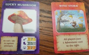 One permanent bonus gives you a dice reroll which is nice but not game breaking. The rest add fixed bonuses to certain capture attempts (such as +2 to Strike or +2 to Scream). This has a nice D&D feel to it which is cool. Unfortunately, two cards give bonuses to every roll you make and one of the capture attempts, Stomps, is always the lowest number on a monster. By the nature of the deck, it’s harder to get multiples of a single number than it is to get sets of colors or runs. Hence why the Stomp is a creature’s lowest value. But when you pair this with the Enhancement to it, and/or the Enhancement to everything, it suddenly becomes the most important card. With the Cloak of Darkness (+2 to everything) and Bucket of Spinach (+2 to Stomp) you can capture most creatures with 1 or 2 cards played. You can capture the most valuable dragon reliably with only three cards.