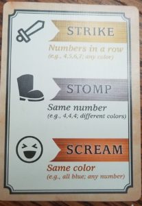 To defeat a monster you must play a set of cards from your hand. The cards you play are either runs (1,2,3,etc) referred as a Strike (yellow), number matches (4,4,4) called Stomps (grey), or color matches (all blue) called Scream (orange). Each monster has different values for each type of play. When you play your cards you then roll a die for each card played and add them up. If you meet or exceed the number, you defeat the creature and add it to your collection. The dice are non-standard d6’s with one “1”, two “2”s, two “3”s and one “4”. That puts the average result at 2.5. If you wanted to Strike that Orange Dragon (15), you’d need a minimum of four cards (max result of 4 x 4 >15) but six to have a reasonable chance of success (average result of 2.5 x 6= 15).