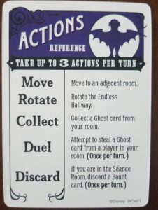 Before we cover the final two types of actions, lets talk about Haunt cards. Haunt cards are awarded to players in a number of ways. If the Hitchhiking Ghosts move past you, they’ll give you one. If they move into your room, they’ll give you two. Note, this is when they move, not when you move by them. You also get one if you collect a ghost from the room the Hitchhiking Ghosts are currently in. There are also some ghosts cards that give you a Haunt card. And most events will have some effect that awards Haunt cards.