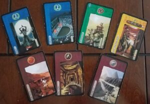 Each of the games components are well enough made. The cards are large which, is nice for the art but this means that they’re bigger than standard cards. They will wear out quickly with frequent shuffling and finding good card sleeves for them are difficult.