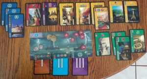 The green cards are science buildings, libraries, universities and schools etc. Each card has one of three symbols. For each set of all three symbols you get seven victory points. Each symbol itself is worth one point per copy. So one is worth one. Two copies, each is worth two for four points total. This can ramp up quickly if you dive hard into it. But be wary, if other players see what you’re trying they’ll know exactly what cards to burn from a hand to build their wonders or get money, just to deny you points.