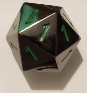 - Why I Picked This Up: This metal alloy 20-sided die from Norse Foundry is a constant reminder of every result I’ve ever gotten on a d20: every side is a “1.” Every single triangular face has a “1” stamped into it. This die is awesome, has a good weight, and rolls exactly like any d20 does for me, “Wow! I crit failed AGAIN! Unexpected!” This is a good gift for your GM to use and worth thinking of on the holidays.