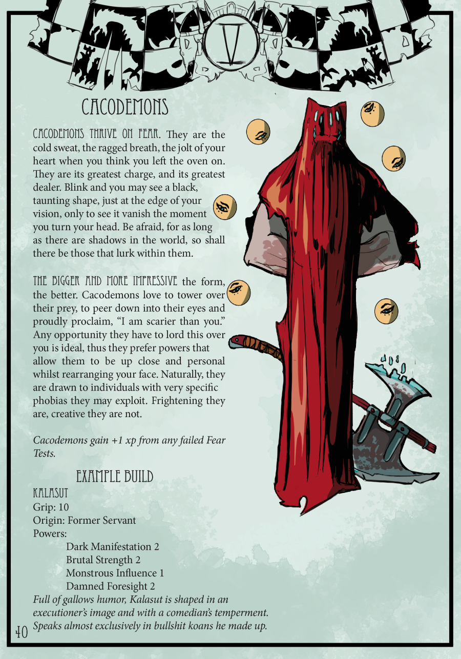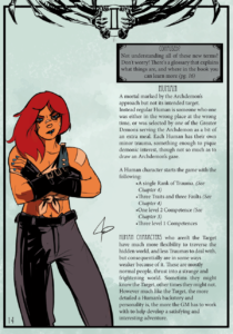 There are two types of characters in the game: Humans and Lesser Demons (and one of the people in your group MUST be the Human Target (a special human that the BBEG, an Archdemon, has taken an interest in)) – which means that this is not a game for a long-running campaign. “Why?” I heard you ask? Every player wants to be the center of attention at some point, and the inclusion of the Target means that a campaign must center on that person. For a short-term campaign though, it certainly keeps the pressure on.