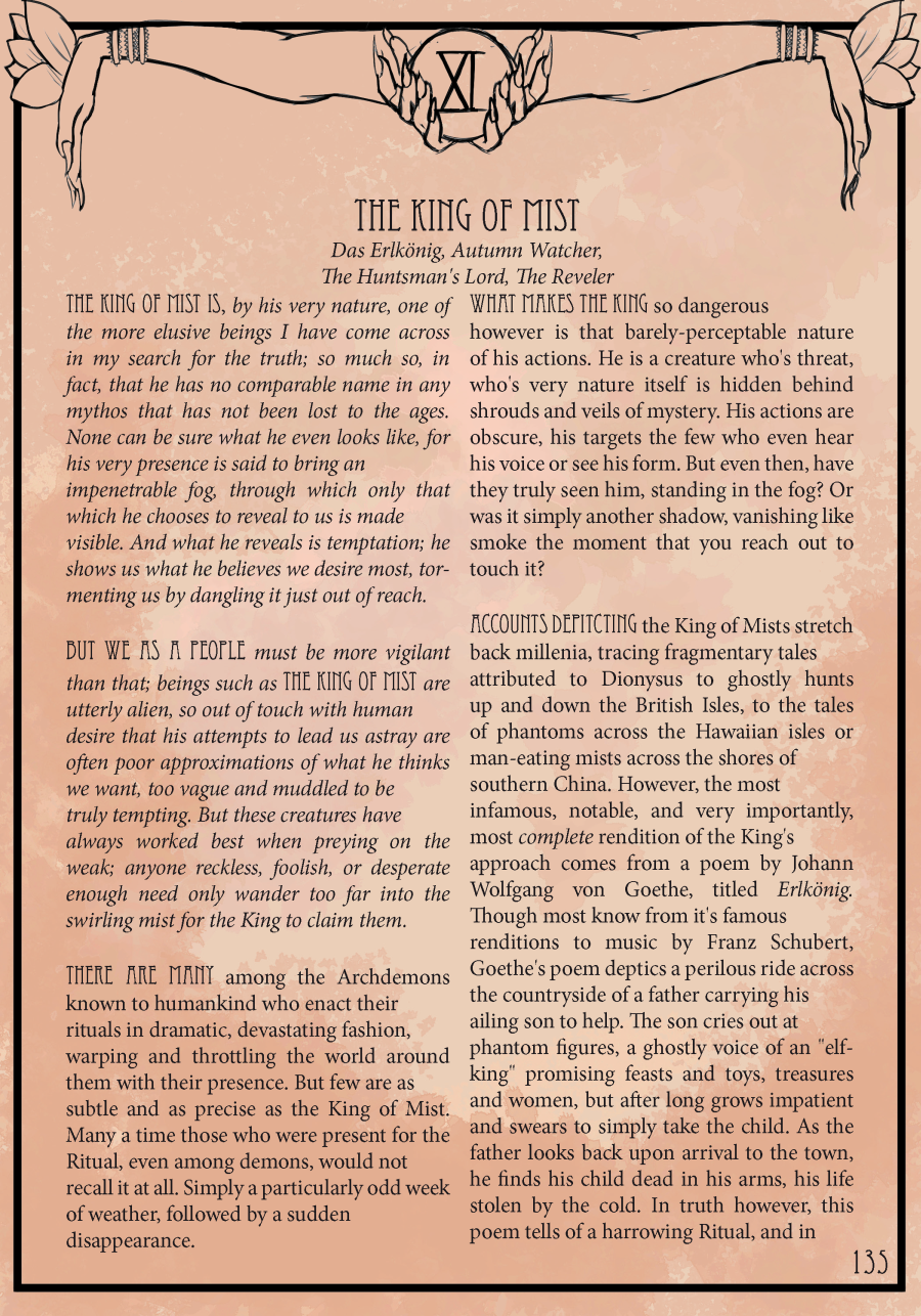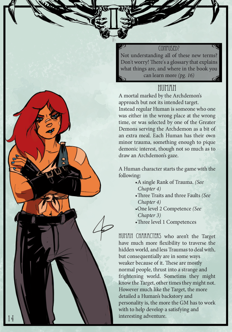 The GM has options of their own to put against the party: Demons, ArchDemons, Manipulated humans, Possessed humans, and the Saboteurs (humans that willingly work with the archdemons). While they’re interesting and well described, I feel as if the GM section lacks HOW you use them against a party. And this is something I honestly noticed throughout the book: It makes a lot of assumptions about what you as a player and GM know already, both about playing and about the world.