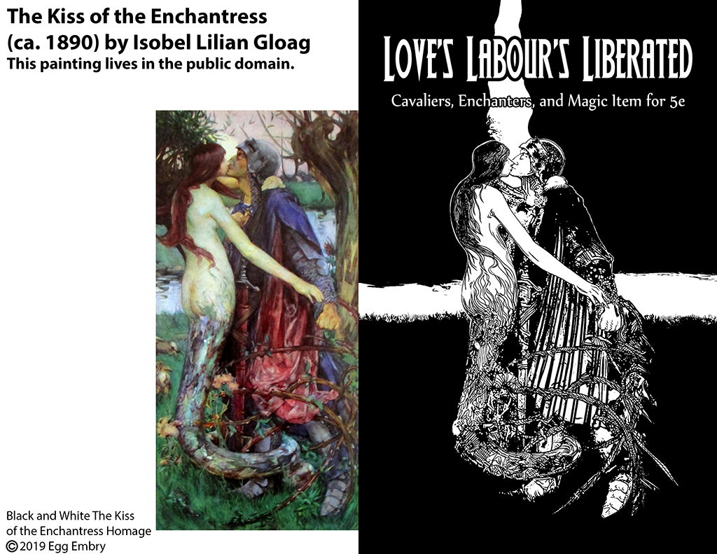 This image offers a lot of possibilities and I knew it was the perfect image for the back cover of LLLiberated. When I did my take, I wanted to bring out those circles through the background and give my focus to the crystal ball. To that end, I added an element from my version of Isobel Lilian Gloag’s The Kiss of the Enchantress to the image (more on her work below). In addition, I put in Rick’s 5th Edition Fantasy logo, which deserves a shout out.