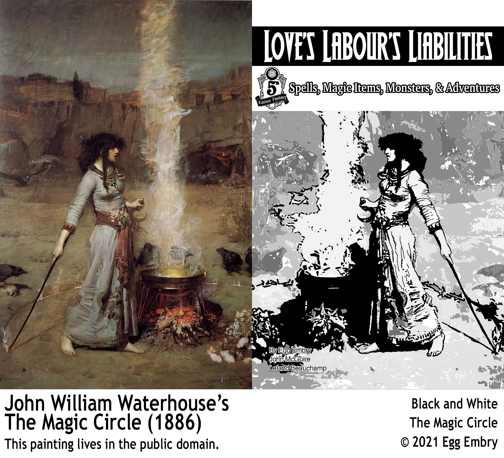 For the cover to the second Love’s Labour’s zine, I did an inked and toned version of John William Waterhouse’s The Magic Circle. Of all of the pieces, I feel this is the one where the original is so superior to my work that I worry John William Waterhouse’s ghost will haunt me! His has the feel of a scene from a movie, something coming to the cauldron and it’s just off-screen. Such an amazing piece, which is why I used it as my inspiration for the cover to Love’s Labour’s Liabilities. I feel that the cover speaks to the adventure and fantasy of Dungeons & Dragons, as such, I’m happy to have this cover.