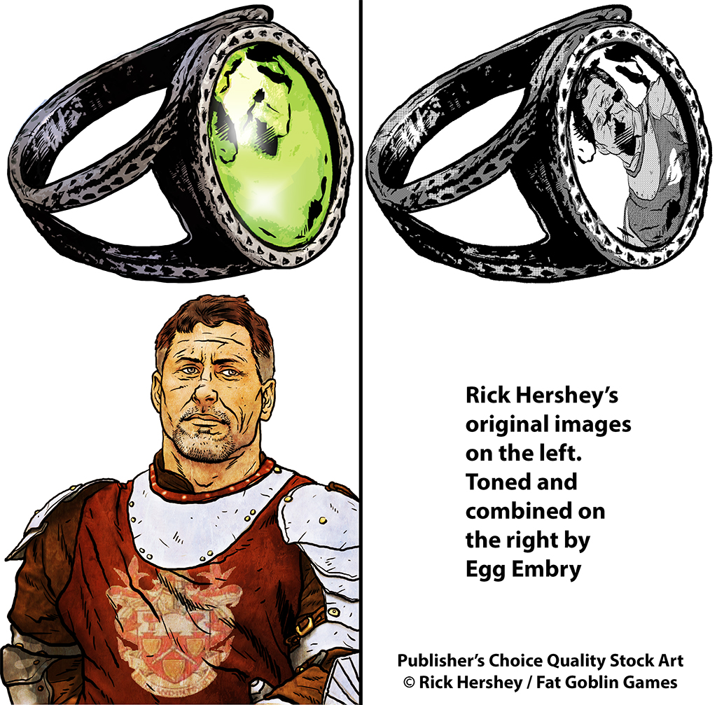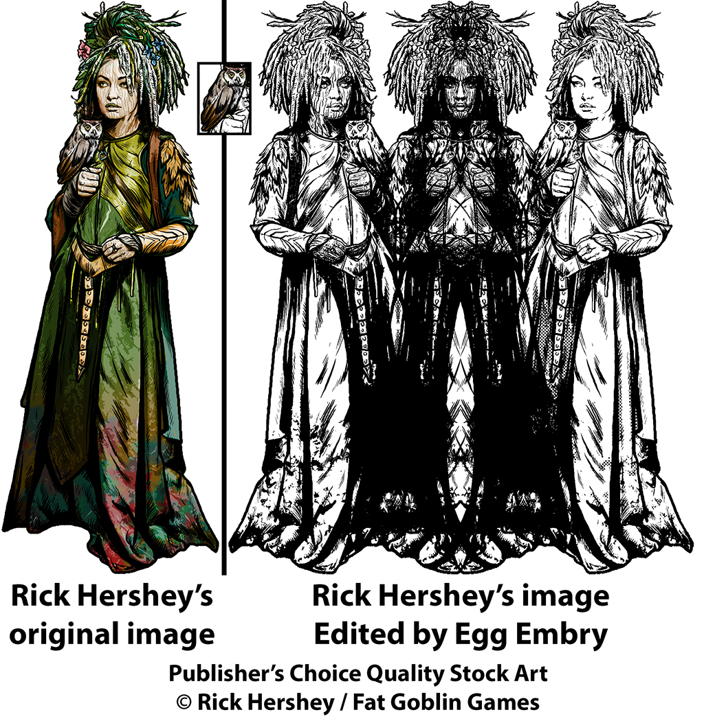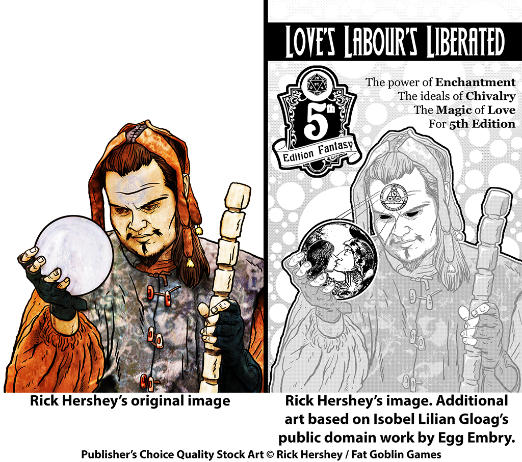 Among the best known stock artists in RPGs are Tithi Luadthong, JEShields (who I’ve interviewed here and here), Storn Cook, Dean Spencer, Felipe Gaona, Bryan Syme, Rowan Withnell, Joyce Maureira, Jeffrey Koch, and Rick Hershey. Rick owns Fat Goblin Games and runs the Fat Goblin Games Patreon where you can you can fill out your fantasy stock art needs. I’ve talked about some of Rick’s stock art plans (here) as well as his art at d20 Radio and during my Love’s Labour’s Liberated (5e) RPG Zine Kickstarter. Since I am running a new Zine Quest Kickstarter, Love’s Labour’s Liabilities, I’m using artwork from Rick Hershey and other sources. But, I like to tweak the stock art I purchase to make it unique to the project I’m working on. To that end, this article is about some of Rick’s pieces (as public domain) I’ve adjusted for the zines I’ve worked on.