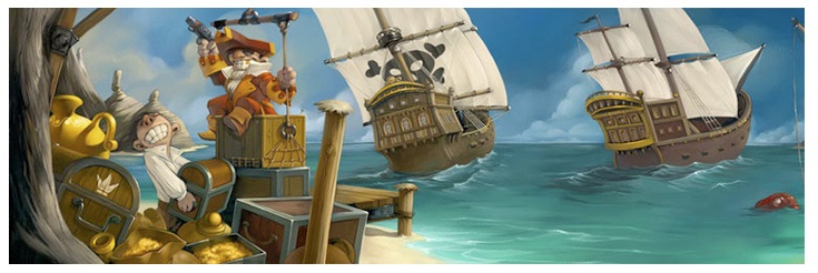 This game is beautiful. All the full colour illustrations are rendered in a delightfully story book style by Mathieu Leyssenne. Each captain’s deck features eleven scenes of piratical antics, and, starting with any card, when laid end to end they match up to depict a short adventure. It’s really charming. The game board is bright and colourful, with no wasted space. Even the back of the board is covered in an illustration of gold coins, so opening the box is almost like opening a treasure chest.