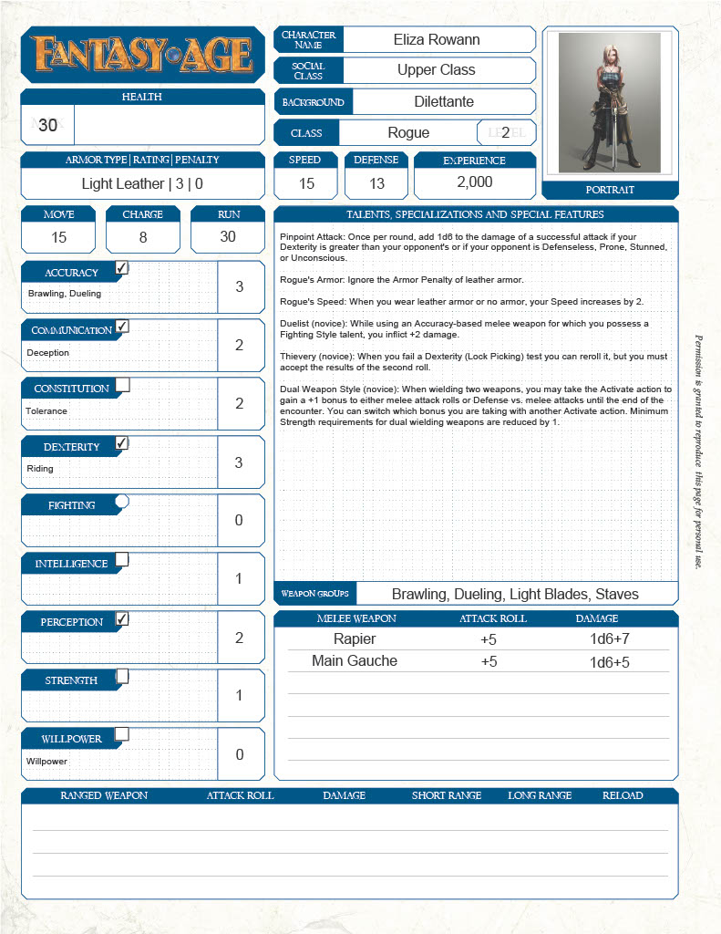She’s still rough around the edges, but the young woman has a fire to prove herself as the best duelist in the land before she’s done and she’s eager to test her mettle. Those that can get past her brash demeanor and haughty attitude will find a firm friend, and those that stand against her will find a stalwart enemy awaiting the clash of steel.