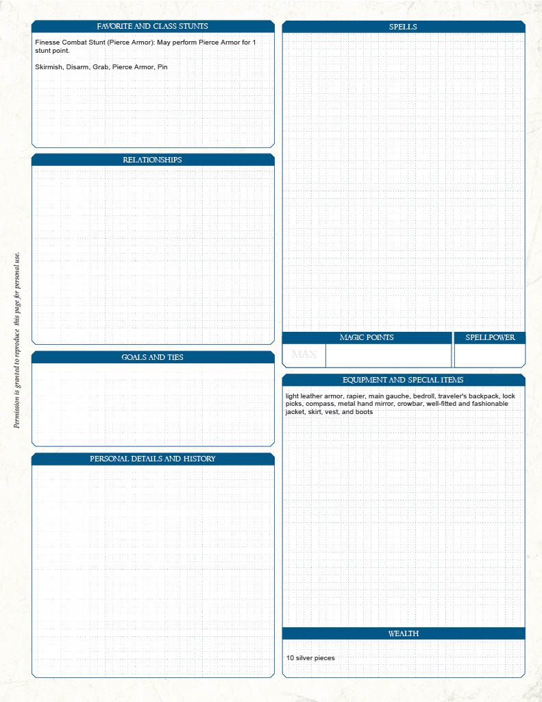 If you’re familiar with Fantasy AGE you’ll see that much of the sheet remains unchanged (though this new one is absolutely more pleasant to look at). The biggest change you’ll likely see is the “Class Stunts” section on the second page of the character sheet. I touched on that briefly above but want to expand on that concept.