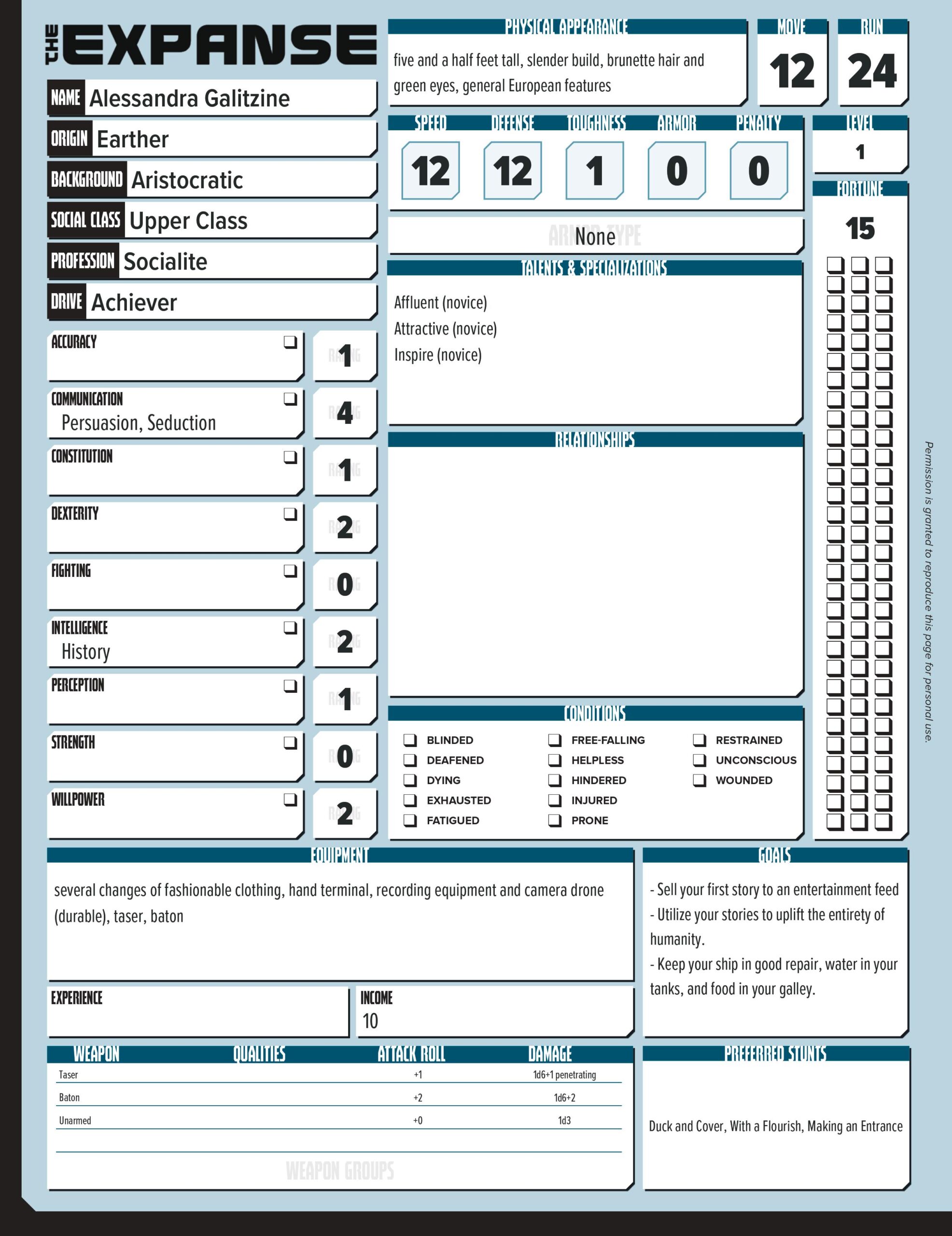 In just a couple of weeks from writing this, I’ll be boarding a plane and taking off for a much needed weekend getaway. My Thursday night online gaming group has decided to go in on a cabin rental for a weekend and finally get in some face to face gaming. And for this weekend, I’m finally putting to paper an adventure idea that I’ve had kicking around my brain for a long time for Green Ronin’s The Expanse. And to do that, I need a crew that can brave the infinite vastness of space. And so I’ve started that process and decided to share one of them with you – Alessandra Galitzine: