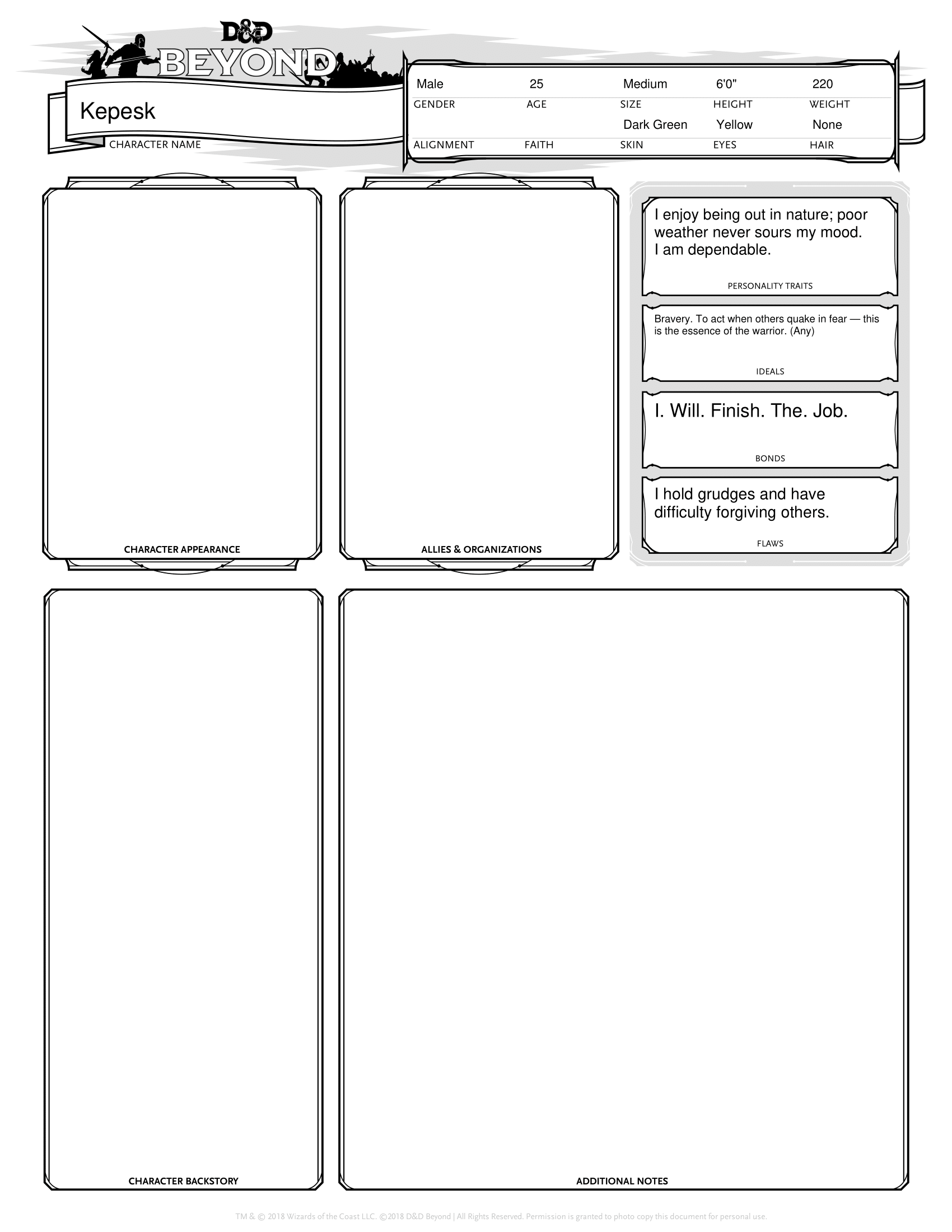 Kepesk was born into a small tribe of lizardfolk that made their way as mercenary warriors, and he was raised from a young age to be a soldier. But he wasn’t trained to be just any soldier. He was trained to be the toughest soldier. He went many days with out food or sleep, forging himself into a weapon that would be able to defeat his enemies alongside his brothers and sisters within the tribe. He grew to be very good at what he did and quickly gained a reputation among his kin and his enemies.