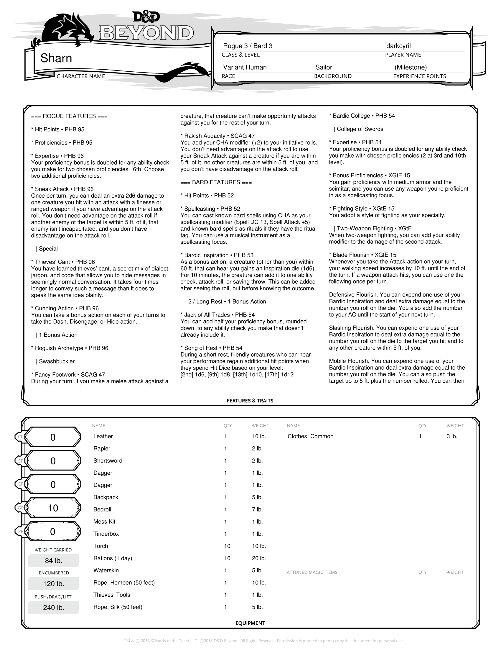 This character was actually inspired by a conversation with an old roommate and gaming buddy of mine at work a few weeks ago when we were throwing around character ideas for him to play in  a 4th Edition game his wife was starting for their family. He had the concept of a pirate bard after discovering the band Alestorm and I liked the idea enough to run with it with some slight tweaks, turning him more into a swashbuckler than your “typical pirate.” We’re exploring the combination of the College of Swords Bard and Swashbuckler Rogue which provides some interesting synergy. The Dual Wielder feat is important because it lets you get a bigger damage die out of wielding a rapier in your main hand instead of a second short sword or scimitar while still maintaining your ability to finesse and deal sneak attack damage. You’re also incredibly skilled with this build with multiple picks of Expertise, getting double your proficiency bonus on four skills at level 6 as this build shows. How you advance from here is really up to you, but I would recommend getting your Bard levels up to at least 6 for the Extra Attack class feature your College gets you. The higher level Swashbuckler abilities are alright, but the benefit to more Rogue levels is of course in increasing your sneak attack damage bonus.