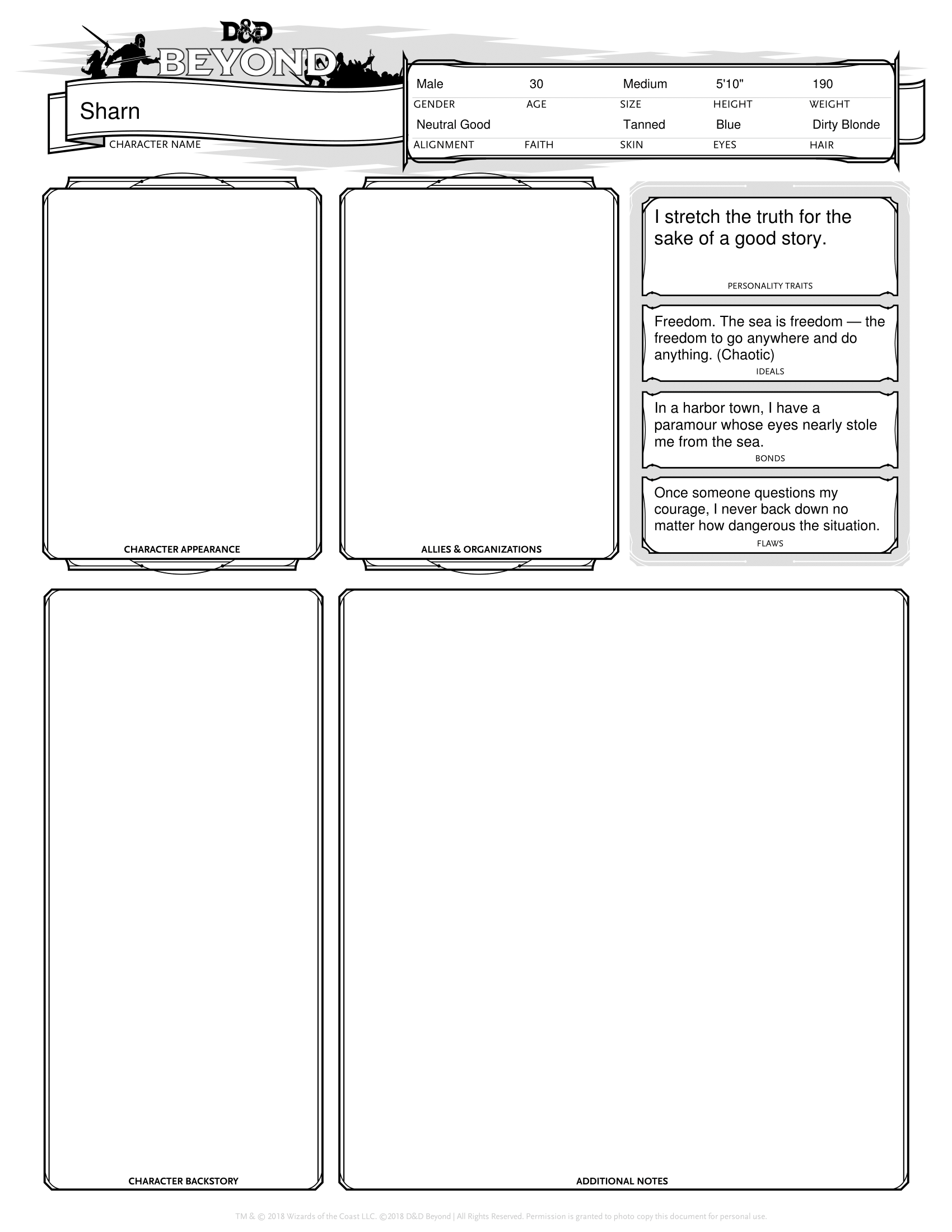 Name’s Sharn. If you need a mate on your boat, I’m your man. It doesn’t matter where you’re sailing or what you’re hauling, I’m happy to join up and earn my keep just to stay on the sea. I’m as good in the rigging as I am with these blades. And I’m damn good with these blades.