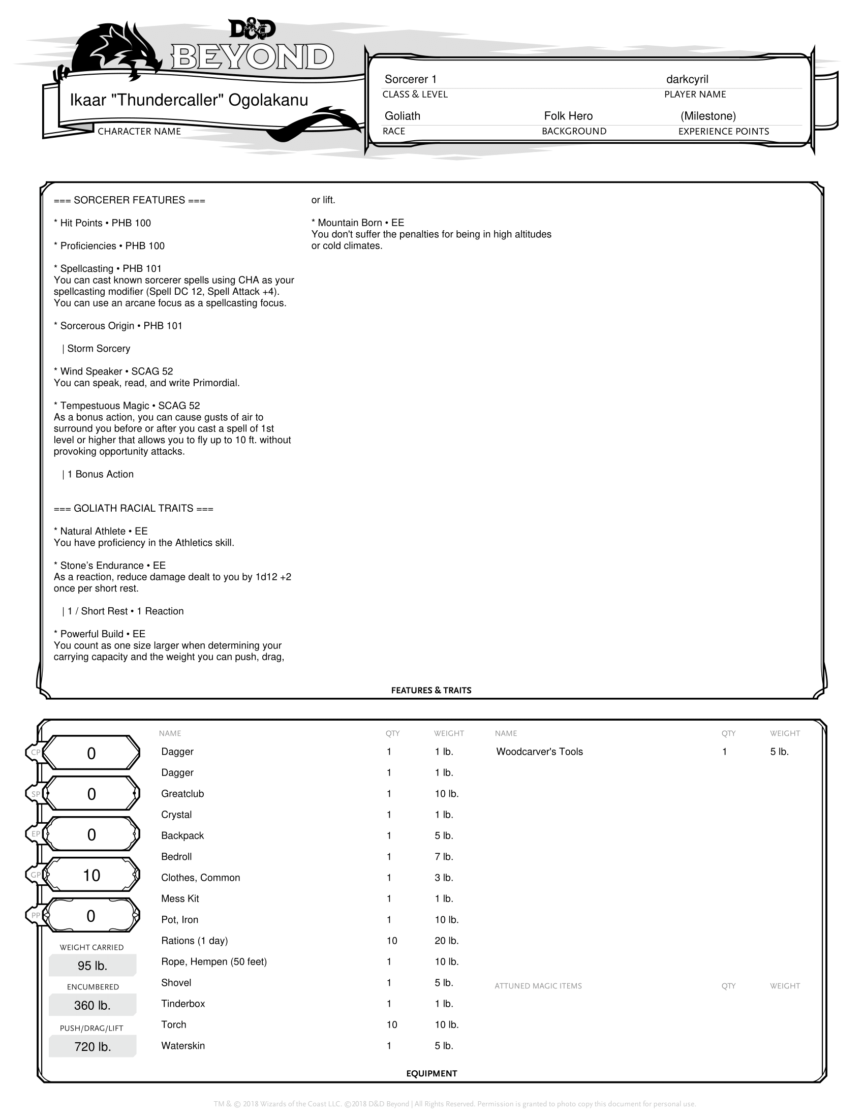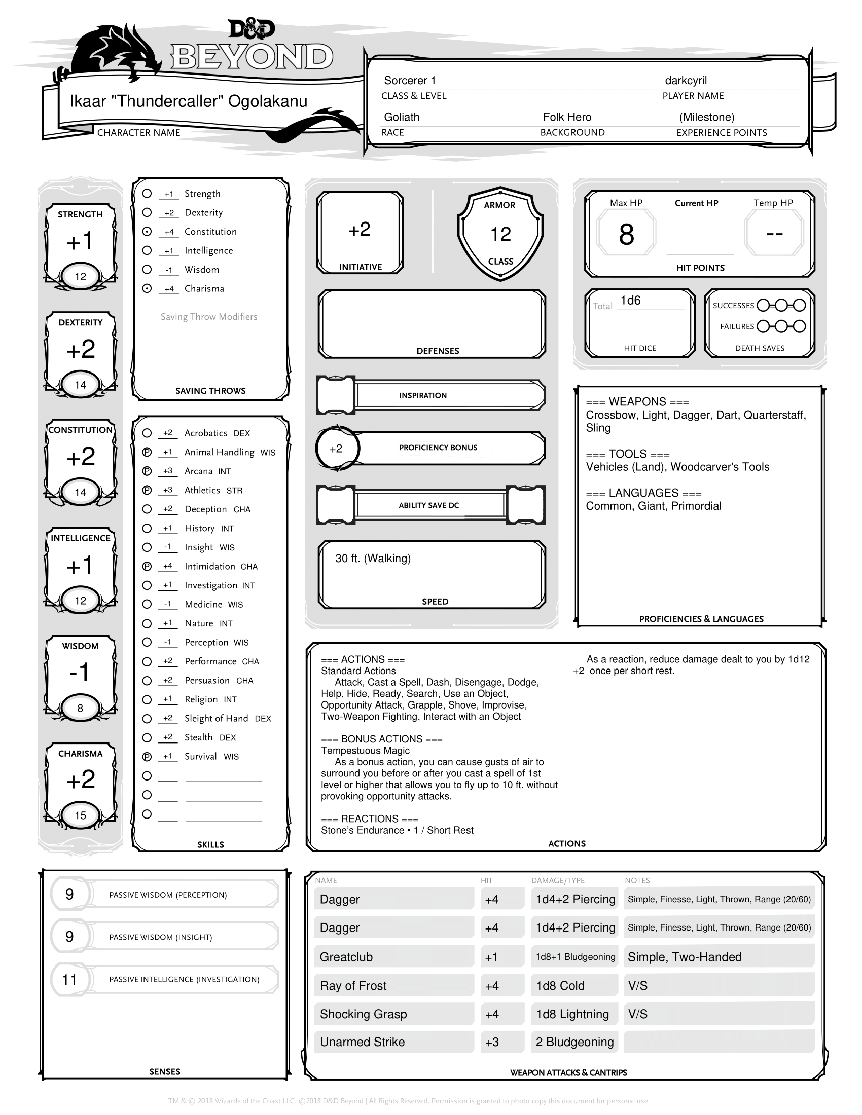 This week I decided to go against type not in background, but rather in regards to class and race. While it’s stated from the outset that any character race can play as any character class, there are some that favor different classes because of their racial abilities and ability score modifiers. However, one of my favorite things about 5th Edition D&D, at least in the lower levels, is that the math is flattened to the point where you don’t have to maximize certain ability scores in order to be incredibly effective in your role. And so I decided to throw caution to the wind today and picked a race and class combination that I had never before considered – a Goliath Sorcerer. Eventually the idea for Thundercaller was born, a young Goliath that came into his abilities at the onset of adulthood and became something of a local celebrity and hero for his powers. His Charisma is nothing great to begin with, but it’s still above average, still giving him a decent chance of using his abilities successfully in combat, especially in terms of combat checks. His spell saves aren’t phenomenal by any stretch, but a DC of 12 gives an unmodified roll of a d20 only about a 40% chance of success. Still, with that in mind, I picked fewer spells that rely on saving throws to be entirely successful or at least still did something on a successful saving throw.