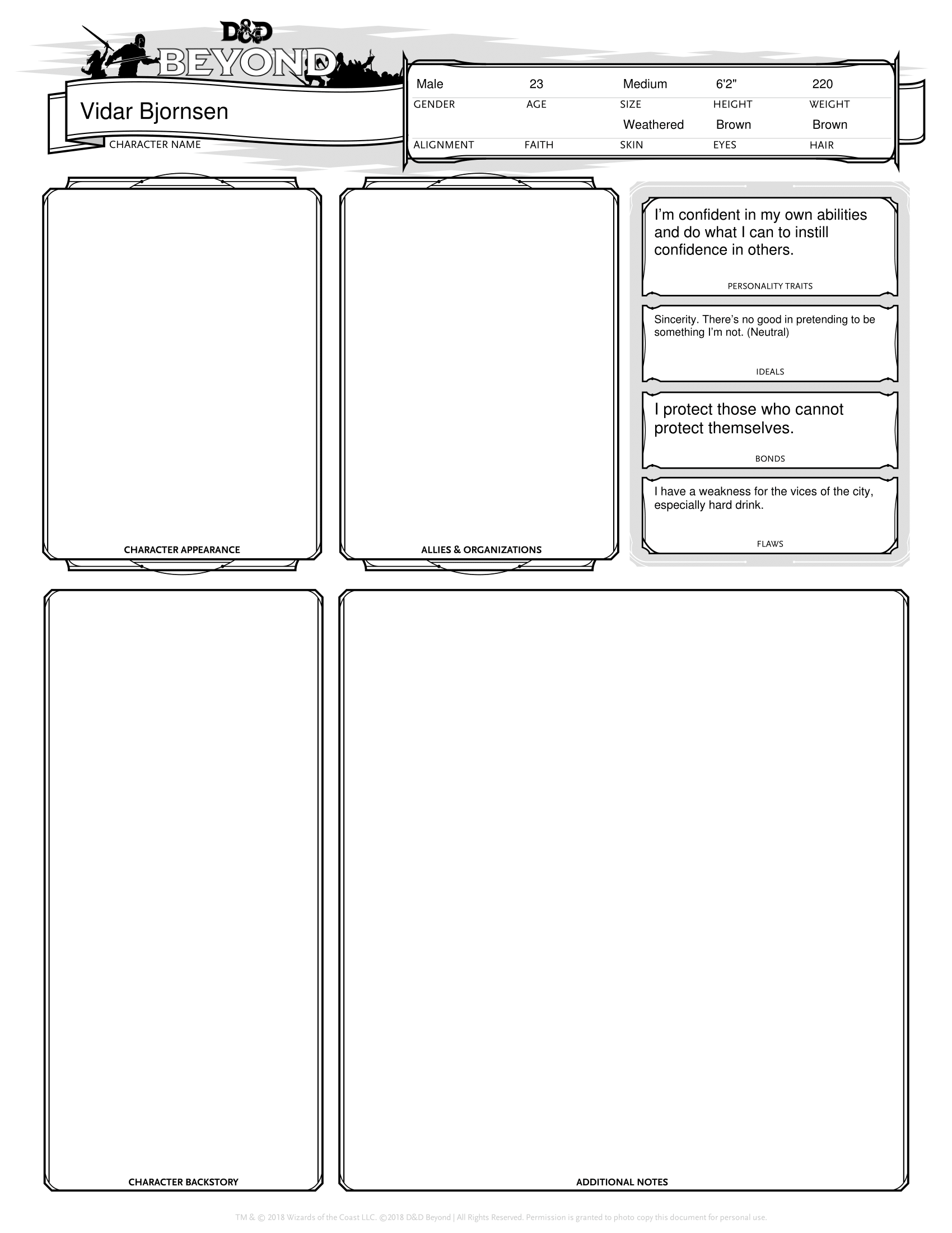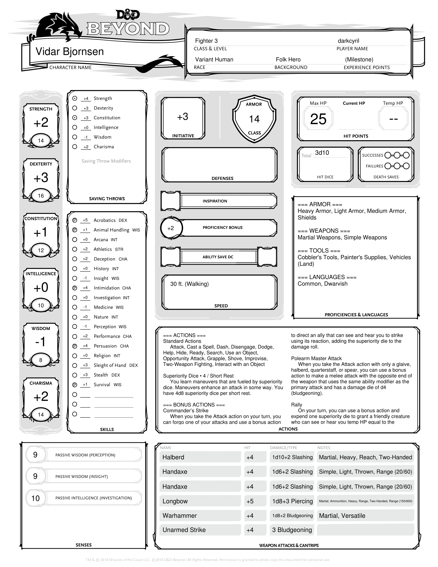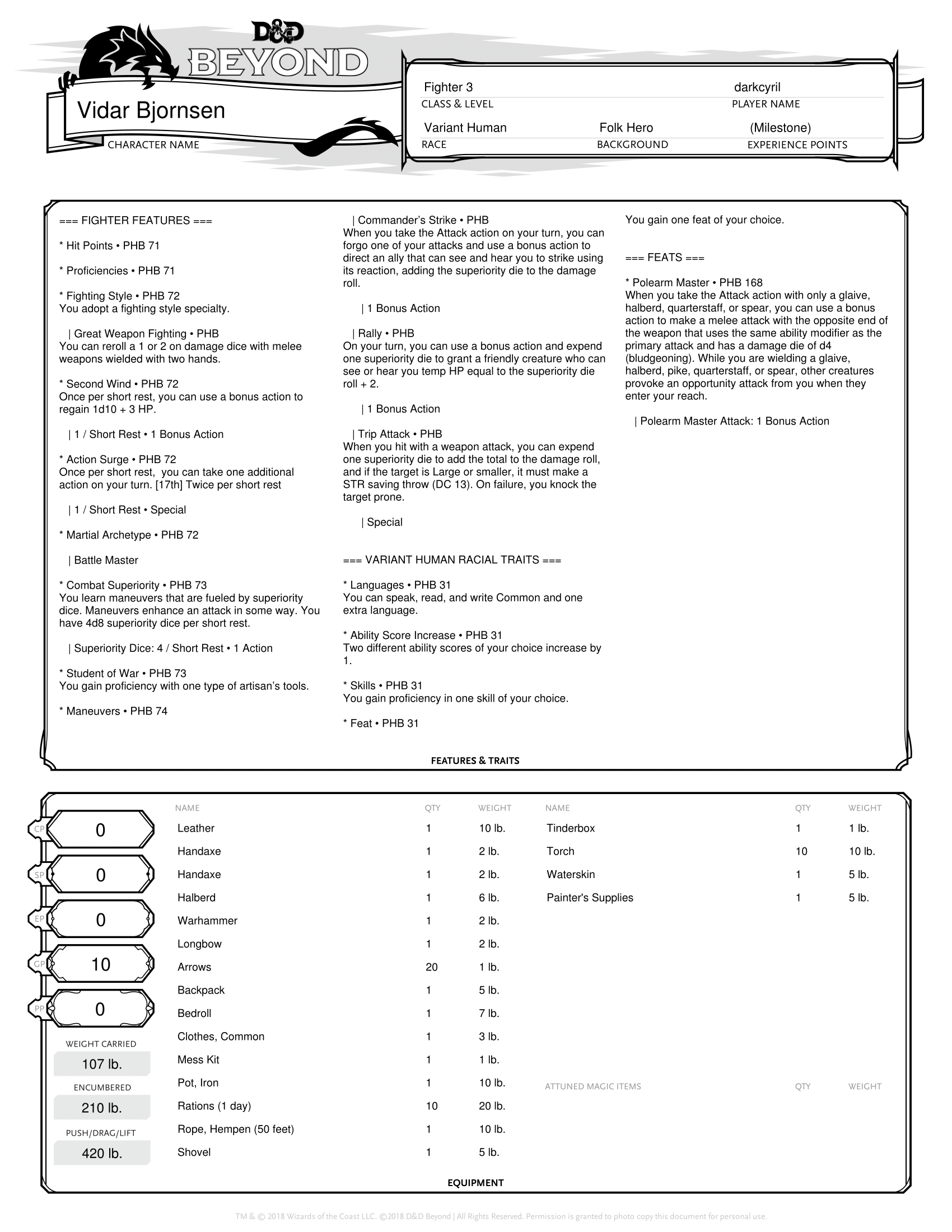 Vidar was born when I decided to create a “non-traditional” fighter in 5e. So often one thinks of a warrior in heavy armor and a sword (or axe – I’m not forgetting all you dwarves) and shield that other combinations get overlooked. I also wanted to create someone that could make the most out of the Polearm Master feat and the idea for this particular Battle Master started to form in my head. He’s ideally suited to take the Sentinel feat at his first opportunity. There are also plenty of combat maneuvers that fit into his motif including Evasive Footwork, Parry, Sweeping Attack, and Pushing Attack and he could easily spend all 20 character levels in Fighter. However, his passion for inspiring excellence in others uniquely suits him for multiclassing into the College of Valor Bard.