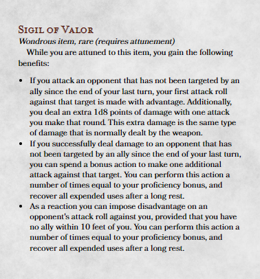 Sigil of Valor was first published in 2015 as part of the Magic Origins set and has been reprinted several times since then. This artifact equipment card grants the equipped creature +1/+1 until the end of turn for each other creature that you control provided that creature is the only one of your creatures attacking. This can be potentially potent if paired with a creature an opponent is incapable of blocking and a decently populated board and can potentially decide a game for you in round or two. Or it can be useful for helping to clear an opponent’s board as they will likely have to declare multiple blockers against your one attacker, forcing them into an uneven trade, paving the way for the rest of your creatures the next round. But how do we translate this card to an item for D&D? Like some other cards in the past, we’re going to have to create some mechanics that capture the spirit of this card instead of attempting to directly translate them, and it might look a little something like this: