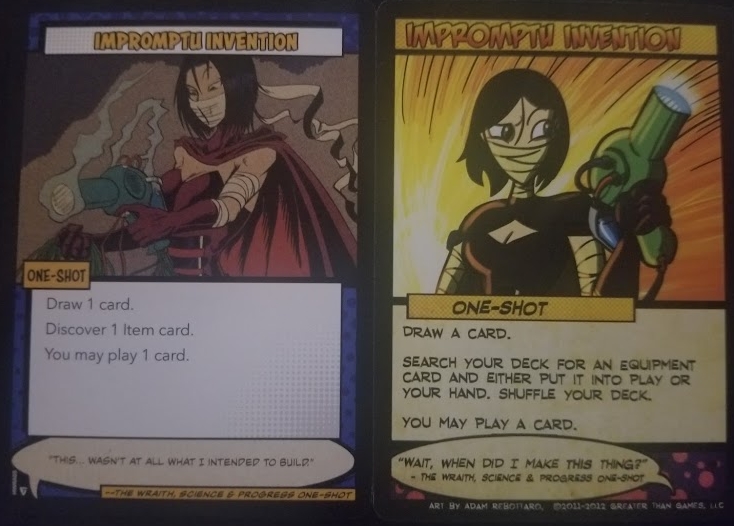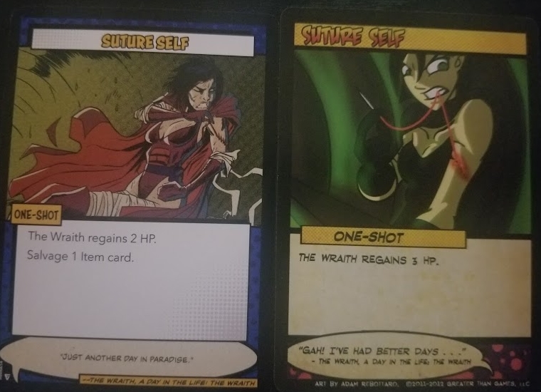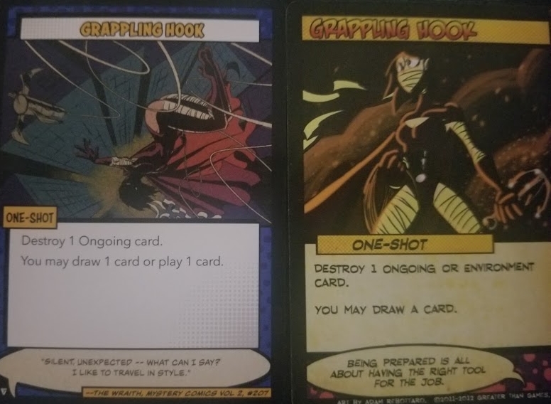 Cards that have effects that take place or trigger during certain parts of a turn are now better called out on the individual cards. A number of new keywords and rule terms have been added into the cards such as the ability to “bury” a card at the bottom of a deck or “salvage” an item from a discard pile. Furthermore, certain key terms within decks have been completely erased from the game – for example, no longer does Tachyon have to worry about counting “burst” cards in her trash pile. I’ve only had a chance to play with a few of the decks so far, but I’m really excited to dig into the rest of them and see what makes them tick, and maybe even break them down here over the coming months. Below are several side-by-side shots of some cards from The Wraith and Legacy’s deck as they appear in the Definitive Edition versus the original releases so you can see the changes in art and even some of the rules changes.