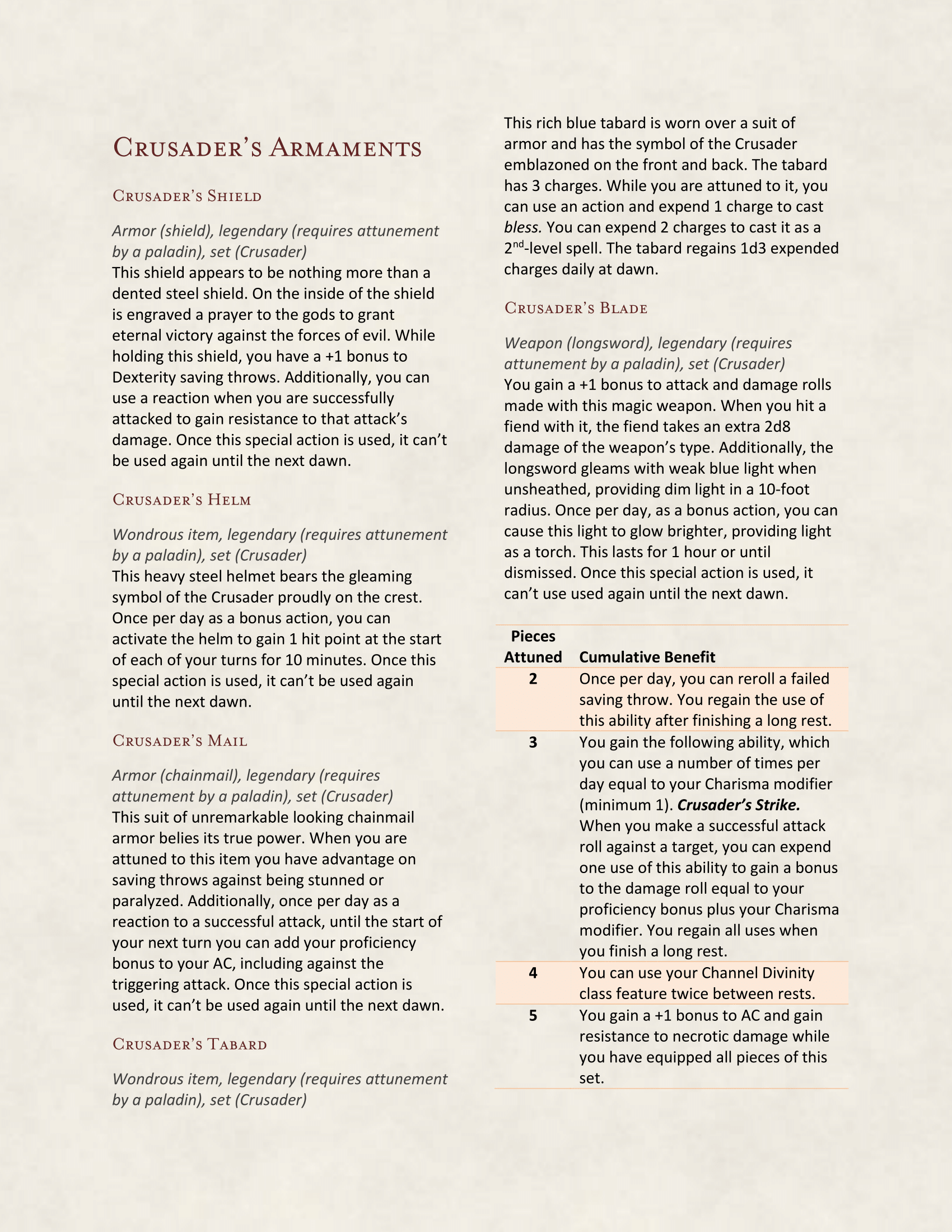 As the rules stand, you can only attune to three magic items at any time in 5th Edition Dungeons and Dragons. However, these item sets are often more than three items – so how do we solve the problem of attuning to all of these items to our character to get the full benefits of the item set? Simple – Item’s that are part of an item set gain a new magical item descriptor of “set” along with what item set they belong to. These items are particularly harmonious. Attuning to the first item from an item set works as normal. Attuning to any further items from that same item set do not count against your limit for attuned items. However, you can only be attuned to any one item set at any given time. If you ever wish to attune to a magical item from a different item set, you must end your attunement with the other item set. This does not stop you from attuning to any magical items that are not part of an item set, but you are still limited to the three item maximum (or one item set and two items not from a set).