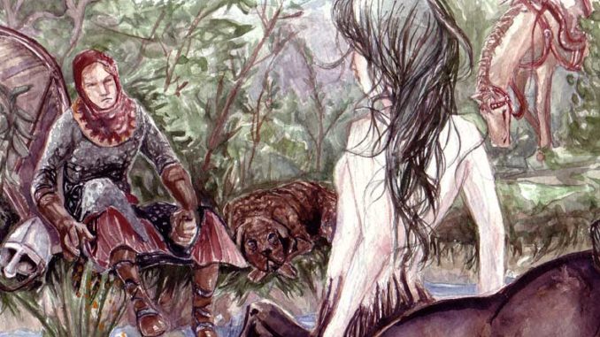 The knight is visited by several animal guides that tell him the only chance he has to heal his wounds is to seek out the maiden known as the Witch of the Westmoreland, as the “water cold and clear will never clean your wound.” He journeys into the forest with his mare, his hunting hawk, and his hounds, all symbols of status, skill, and strength for the knight, meeting an owl along the way who asks him why he is in the woods. He tells the owl that he is seeking out the maiden that is said to live within. He eventually reaches the lake where this maiden is said to dwell and leaving his animals behind, but ready to come at the sound of his horn, he casts goldenrod into the lake to summon the maiden. When she appears, it is in the form of a centaur – “one half the form of a maiden fair with a jet black mare’s body” and she flees at the sight of the knight.