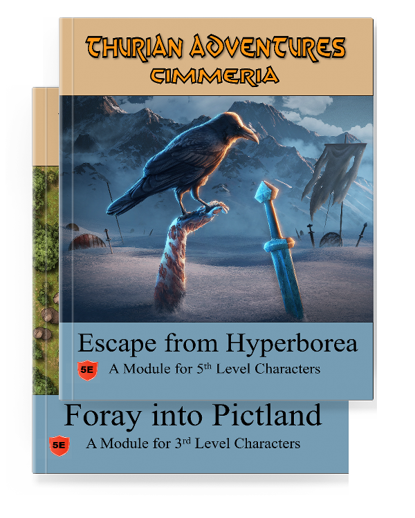 EVAN: We will be offering the Player’s Guide to Cimmeria, the Game Master’s Guide to Cimmeria, a Map of Cimmeria, a 3rd Level Adventure: Foray into Pictland and a 5th Level Adventure: Escape from Hyperborea. Both adventures were played at Origins this year and the excitement and feedback was very encouraging.