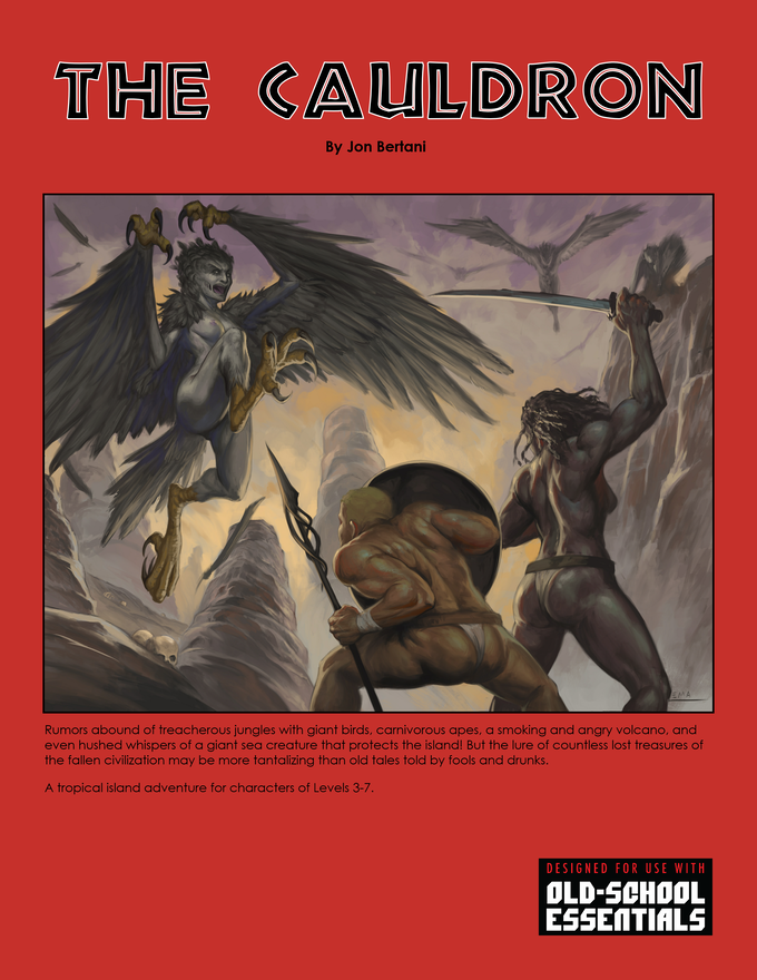 “The Cauldron” is an island adventure that once had a thriving empire that was destroyed by a volcano and the survivors split up due to different religious views and now populate each side of the island. A few adventure hooks are the PCs find a treasure map that leads to one of the old temples on the island (which attracts other treasure hunters to compete with them), or the party is shipwrecked, etc. The focus of the adventure is exploration—of the island, underwater caves/lairs of the island, and the jungles, all while the PCs are in-between two warring villages.